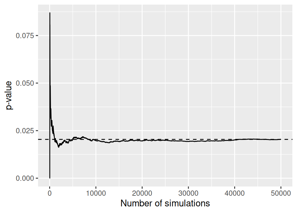 Later in the course we’ll study how to evaluate the error we might be making after a certain number of simulations. Of course, if we know the error we might be making then we will be able to decide when we have done enough simulation. For example, if we were doing a test at the 5% level, we might (see later) find that we’ve actually done enough simulations to decide to reject after just a few thousand simulations, but where the true p-value is closer to the significance level we may need to do many more simulations to be absolutely certain which side of rejection/non-rejection we lie.