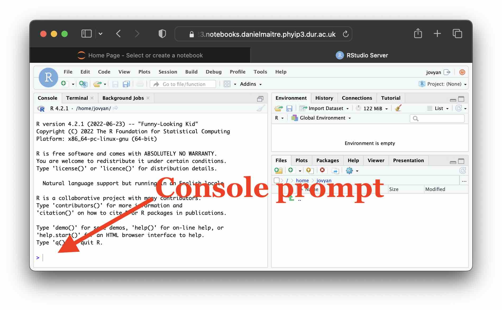 For this first simple work sheet, we will just use R in “interactive mode”, where you type in code and immediately execute it by hitting enter. To do this, simply click at the console prompt indicated in the following image and type there.