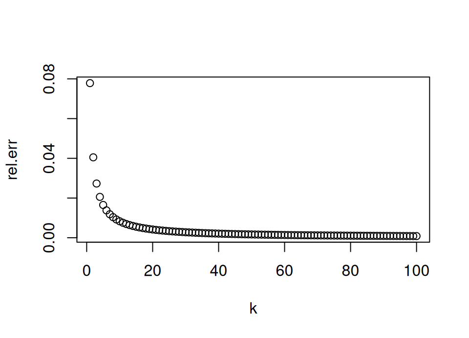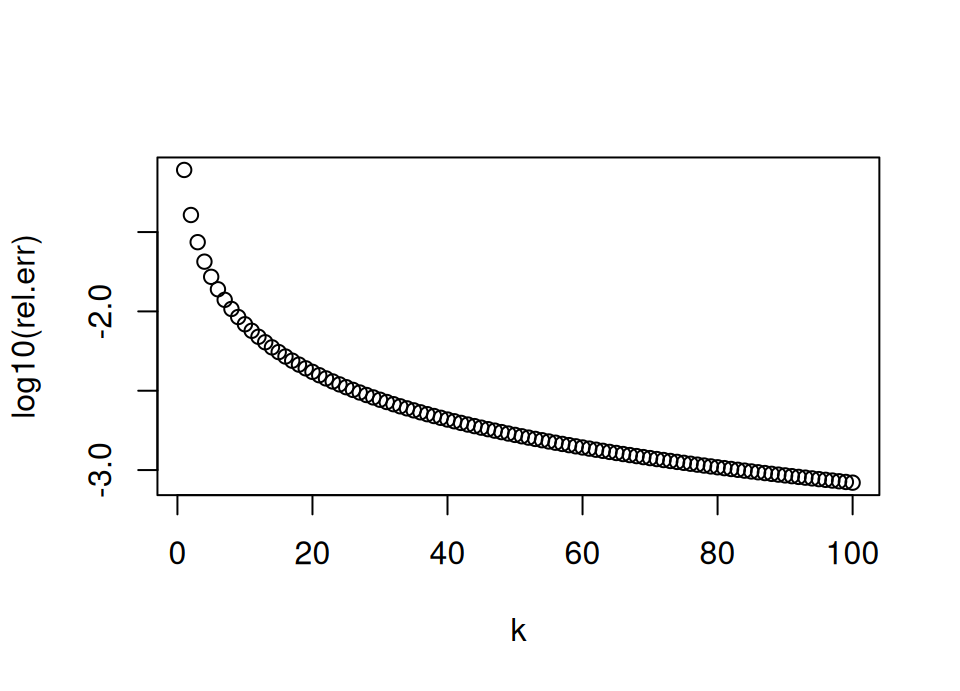 The two commands after it create simple scatter plots of the relative error in computing \(k!\) using Stirling against the value \(k\). The second is on the \(\log_{10}\) scale which is easier to interpret since we can immediately deduce the number of leading zeros in the relative error.