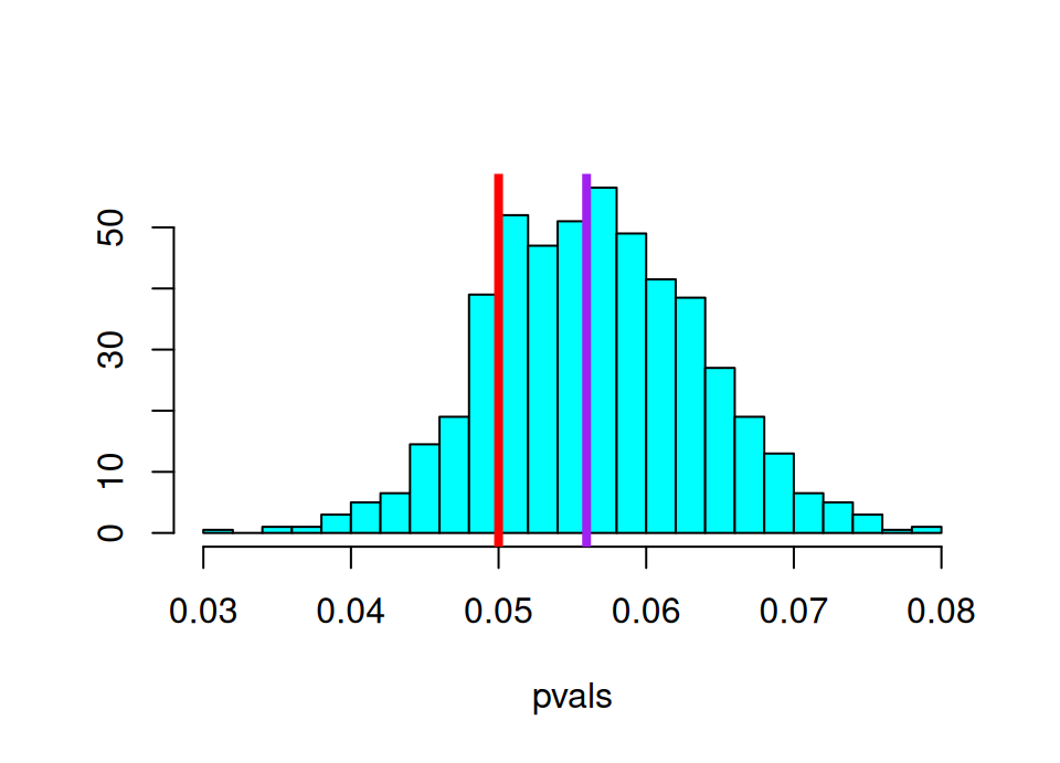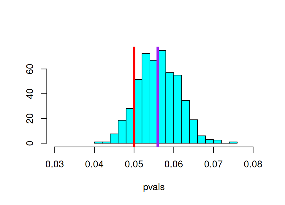 We can see here that the p-values are at least centred on the true value (the purple line), but what might be worrying is that a large part of the left tail is below the red line … in other words, on the opposite side of the \(\alpha=0.05\) significance level.