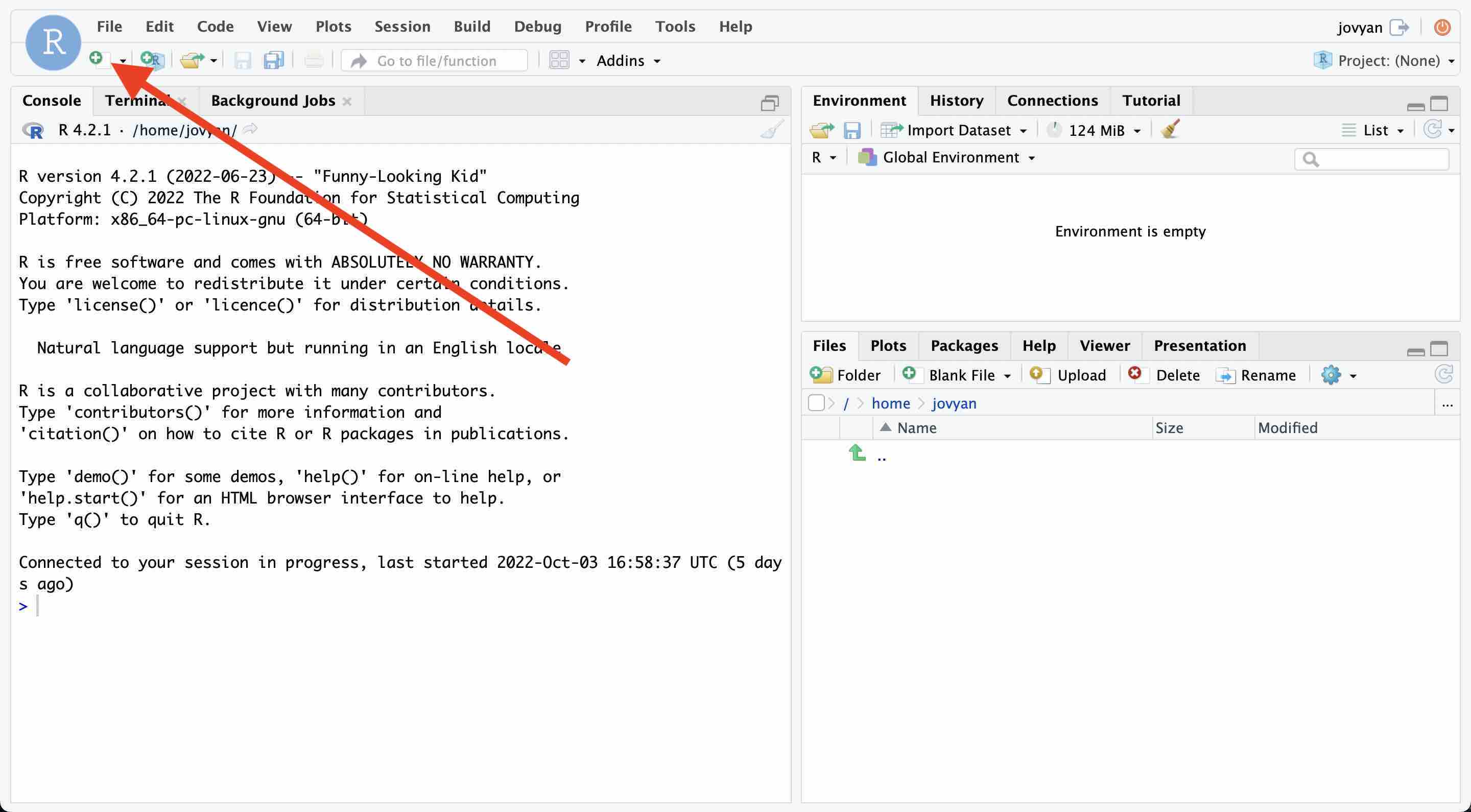 NOTE: if you are using the Github Codespace and get a popup error saying something about a previous session crashing, this just means you didn’t follow the instructions on the the appendix page “R and RStudio” linked here properly when ending the last session … you should always press the red standby button at the very top right of the page, then use the bottom left button to stop the codespace before closing the browser! Don’t worry, nothing bad has happened, but you can avoid the error in future by shutting down everything cleanly – don’t hesitate to ask if you’re unsure.