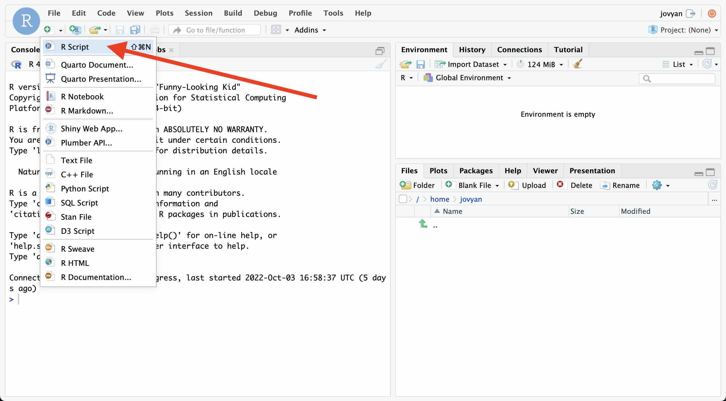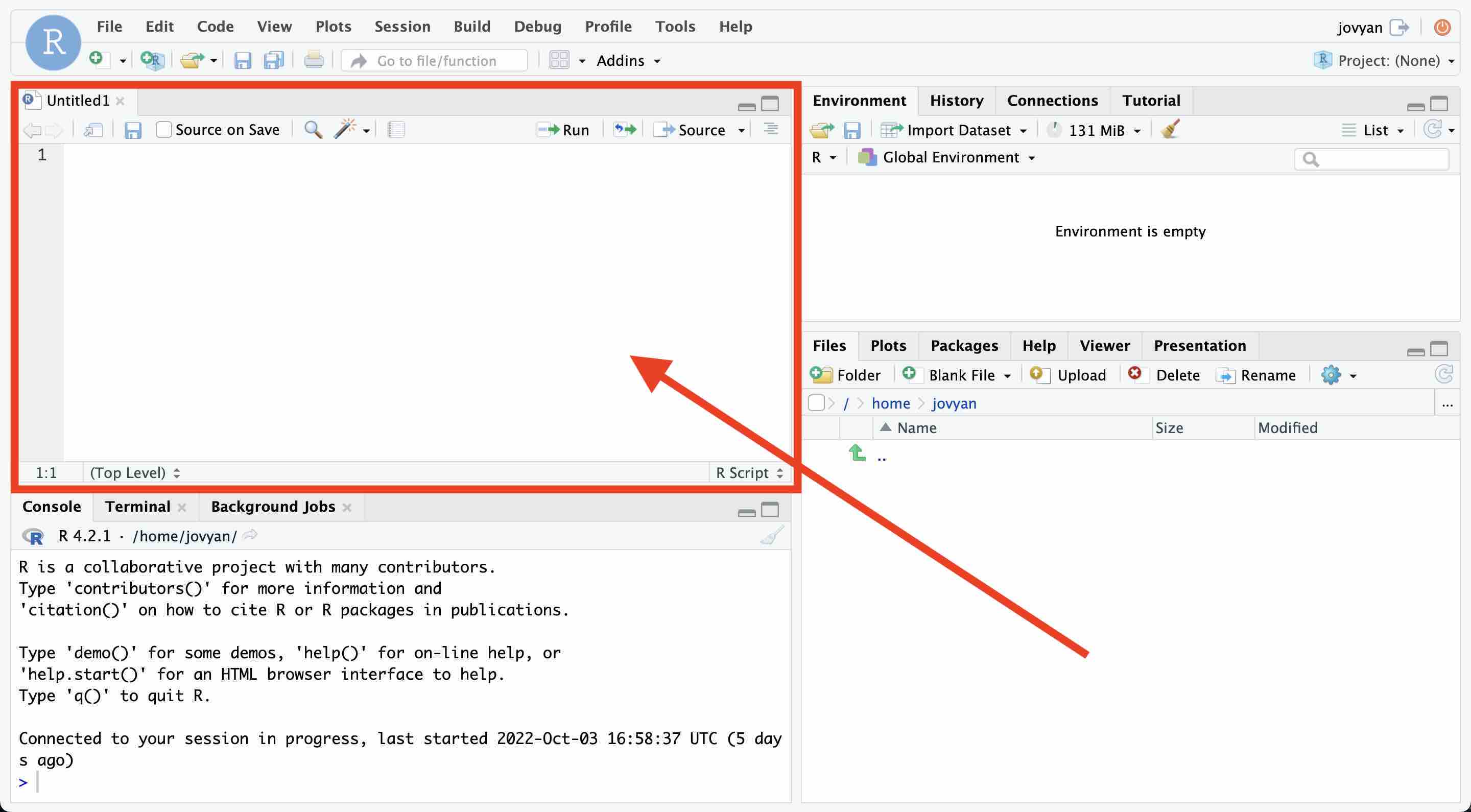 Last week we wanted to get going quickly, so you just used RStudio in interactive mode. However, it is usually better to write code in a script file and then run that code. Create a new script file as follows …