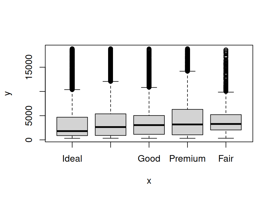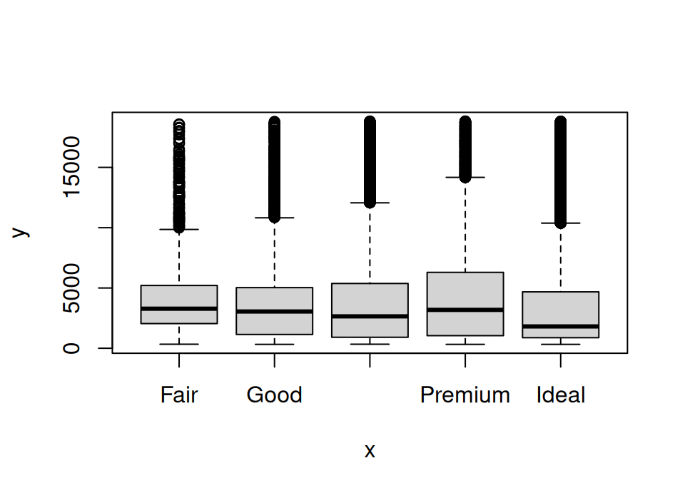 price(y-axis) againstcut(x-axis) using just the baseplot()function. Note the order of the categories on the x-axis. - Use