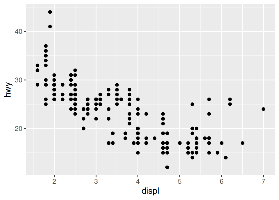 ggplot(mpg, aes(x = displ, y = hwy)) +
