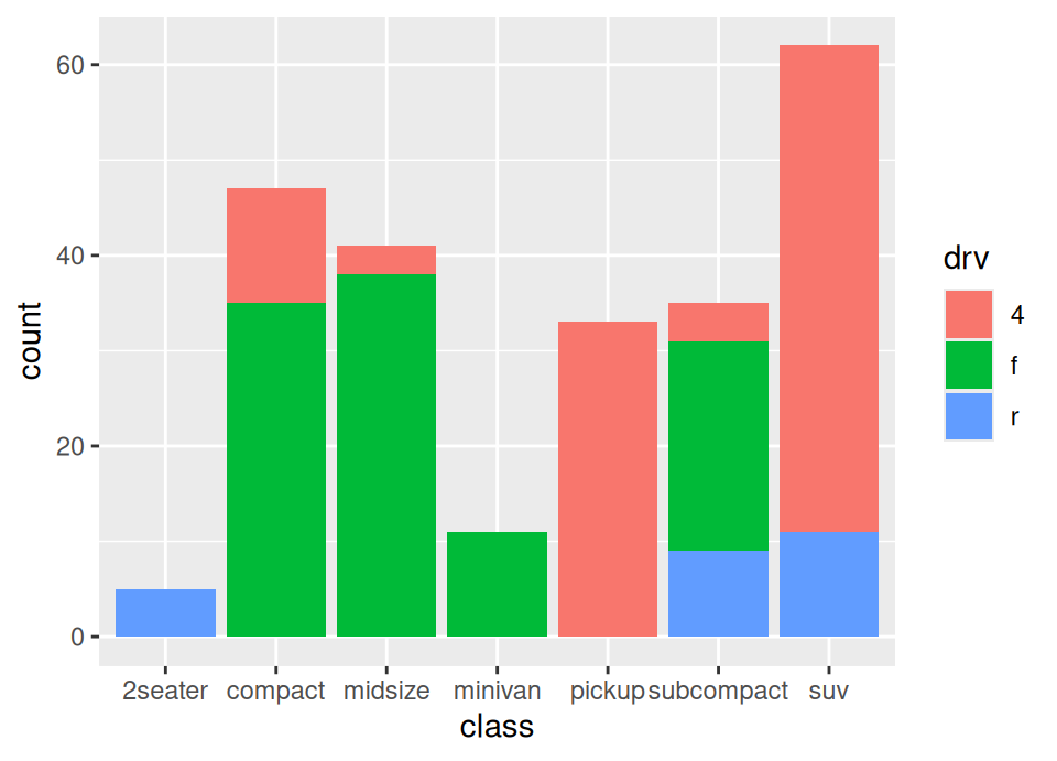 geom_bar(). Create a bar chart ofclass. Note you only need to mapx.Column charts plot pre-calculated values (heights) for categories. The geometry for this is