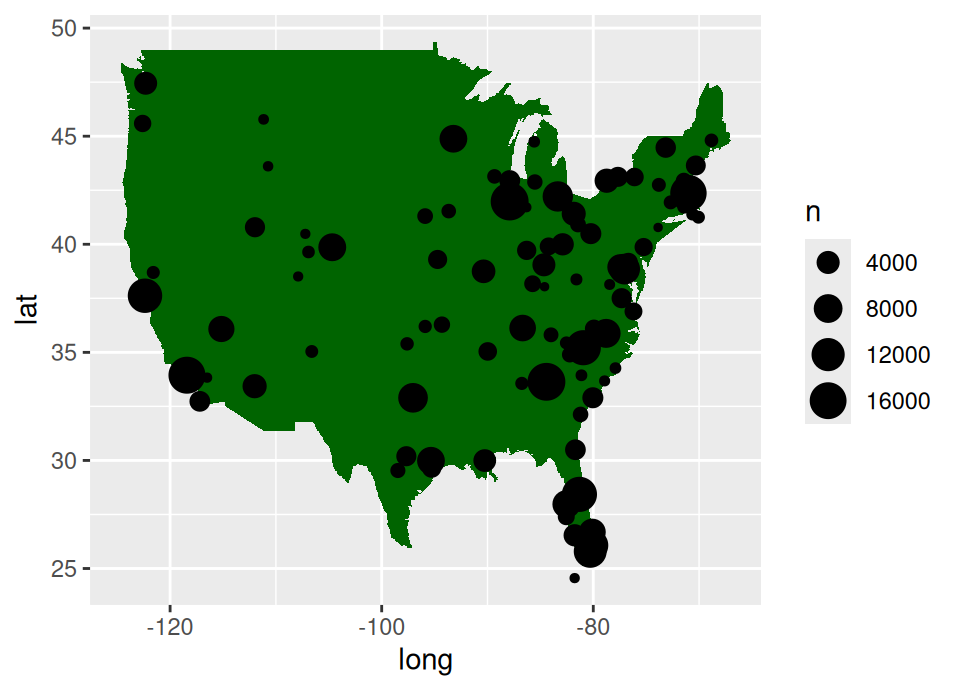 geom_polygon(aes(x = long, y = lat), data = usa, fill = "darkgreen") +