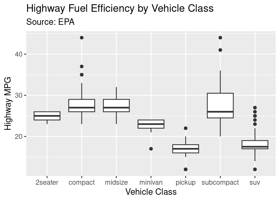 labs(title = "Highway Fuel Efficiency by Vehicle Class",