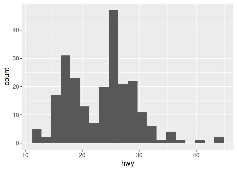 geom_histogram(). Create a histogram ofhwy. Try changing from the default to use exactly 20 bins.Bar charts count the occurrences of categories. The geometry for this is