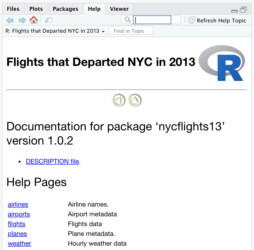 The easiest way to find the help file for a package is to go to the packages tab, search for the package, and click on the name …