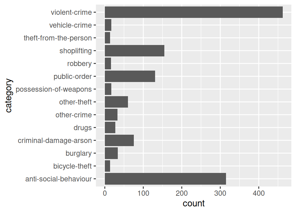 The UK Police forces provide open access to certain crime and policing statistics via a web API, which is accessible from R. A โweb APIโ is basically a website which you can talk to programmatically from your code, rather than having to copy and paste information into R.